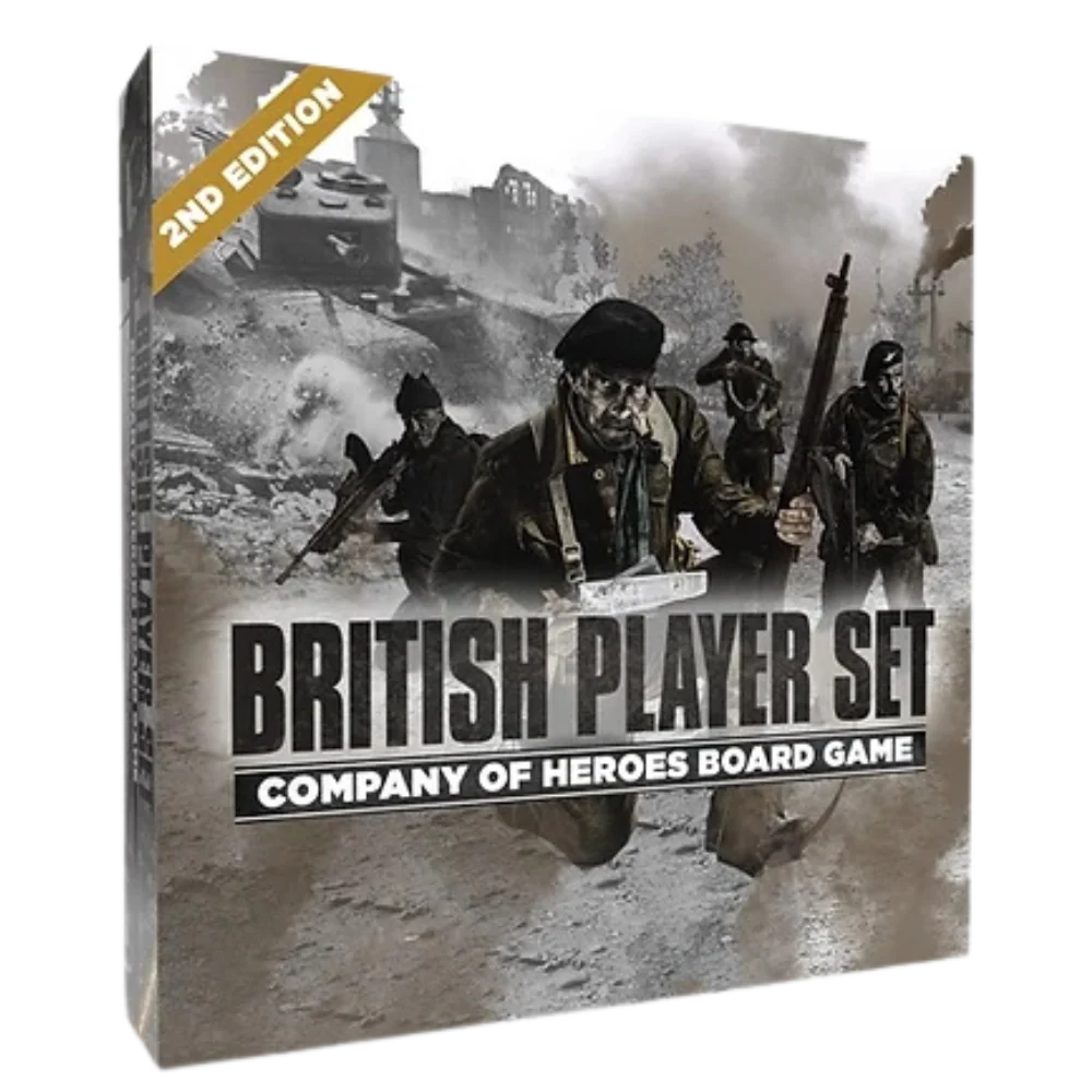The British Faction Player Set includes all the components you need to play as the British in the Company of Heroes board game, such as command cubes, dice, infantry trays, vehicles, tokens, and cards. It also includes a faction board that shows the British tech tree and special abilities.