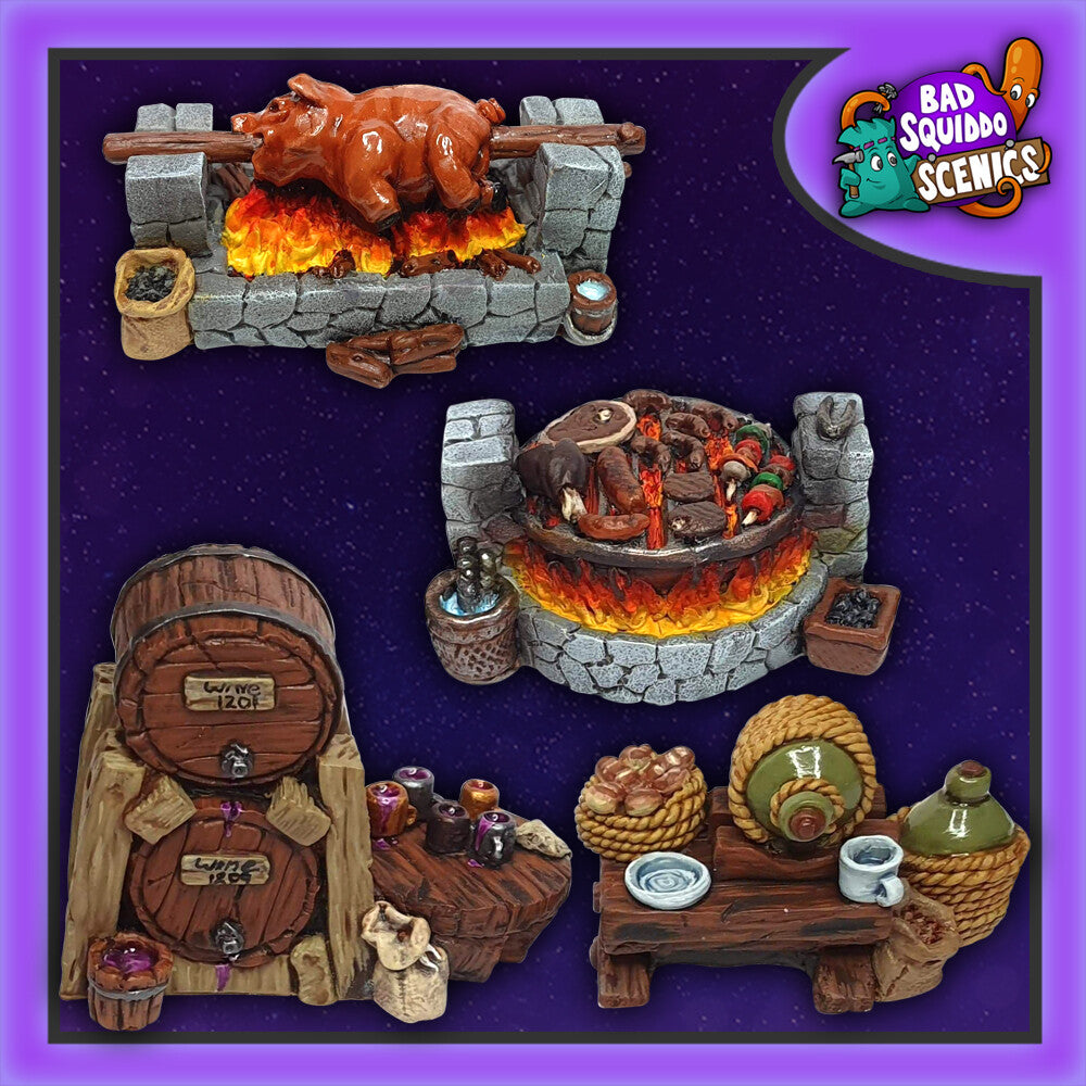 4 pieces of unique hand sculpted furniture for a BBQ in an olde or fantasy environment. Your adventurers need to celebrate their victory, so there is grub and ale abound! Or perhaps this is the party that your gang is sneaking up to?